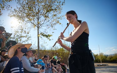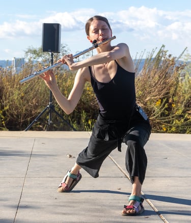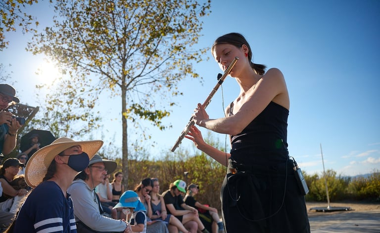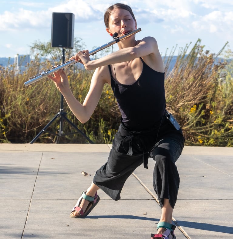 One of the central themes of this work is a connection/disconnect from nature, and its consequences for the current state of our civilization. In this sense, our environmental crisis is equally a spiritual one, reflected in aesthetics and our sense of beauty. In Bitela, Dominyka (flute performer) grapples with this theme by building a free improvisation from ancient Sutartinės melodies, hypnotic Lithuanian folk songs which describe and reflect their deep traditional relationship with nature (Lithuania was the last Pagan society in Europe). The longing for this connection and the pain caused by harsh urban environments, including the Soviet “sleeping communities” of her hometown, are expressed through her spontaneous sound creation and choreographed movement together with a dancer. Sounds are created through the flute and voice, and the audience is welcome to join as performers move in the circle or view them from the steps above, with the city, hills and mountains behind them. The tension between the built environment and nature visible from the Overlook influences and deepens the particular mood of the space and time being channeled into the improvisation, and provides a perfectly fitting backdrop.